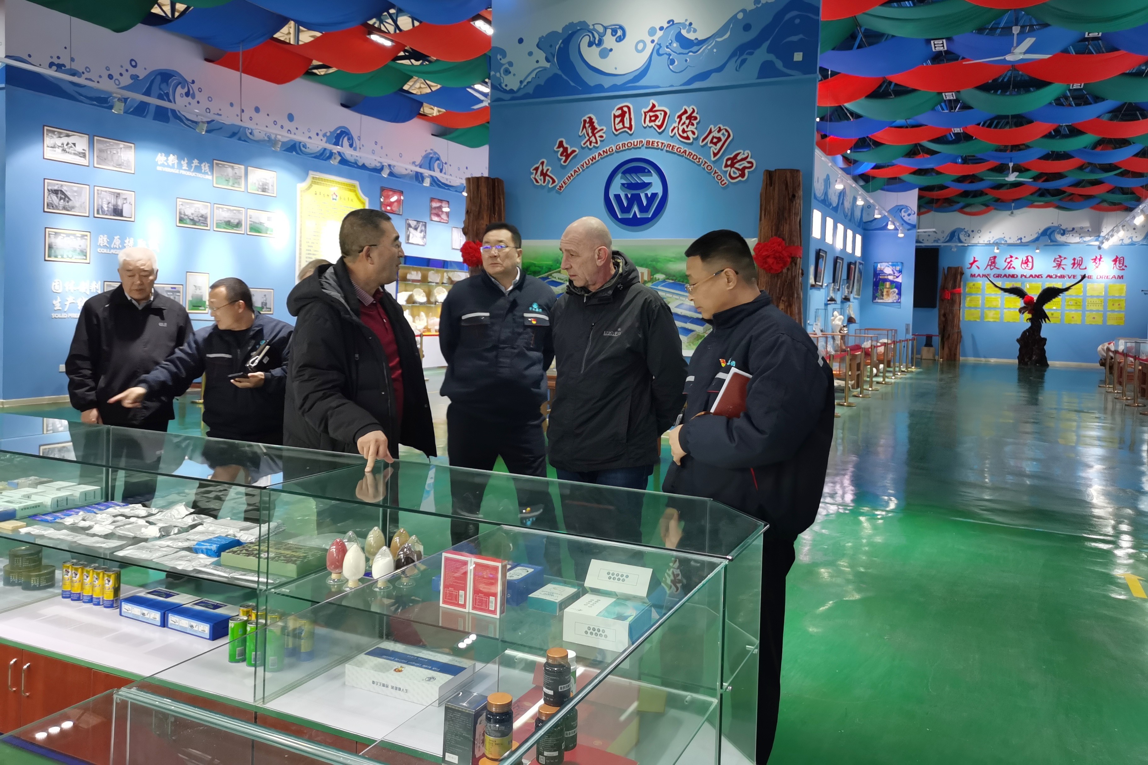 在李柏省经理、于飞经理、白义化经理的陪同下,外商参观了金琳公司、宇祥公司、海洋生物车间。随后苗强董事长陪同外商参观了宇王集团产品展示大厅,并对产品进行了详细的介绍,使外商对宇王集团发展现状及企业实力有了更深入的了解。参观后双方在海洋馆会议室进行商务洽谈。