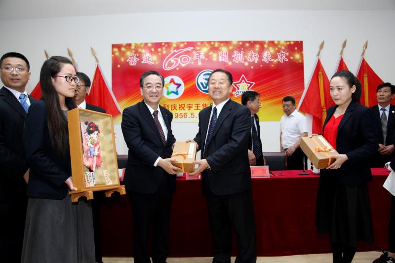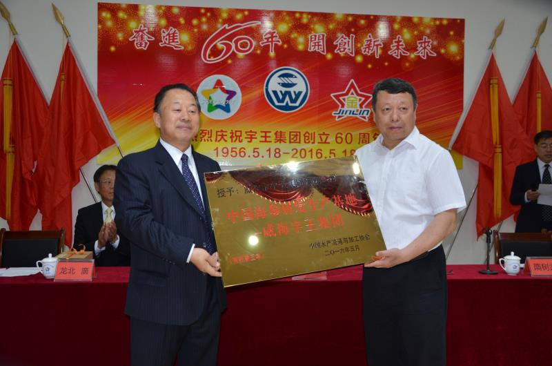 中国水产流通与加工协会秘书长邸刚代表行业协会为宇王集团创立60周年表示祝贺,并向宇王集团颁发了“中国海参研发生产基地”和“威海市宇王集团爱之信商学院指定培训机构”的牌匾,向宇王集团合作客户日本株式会社辻野、日本株式会社丸福食品授予“中日友好合作最佳诚信商社”证书。