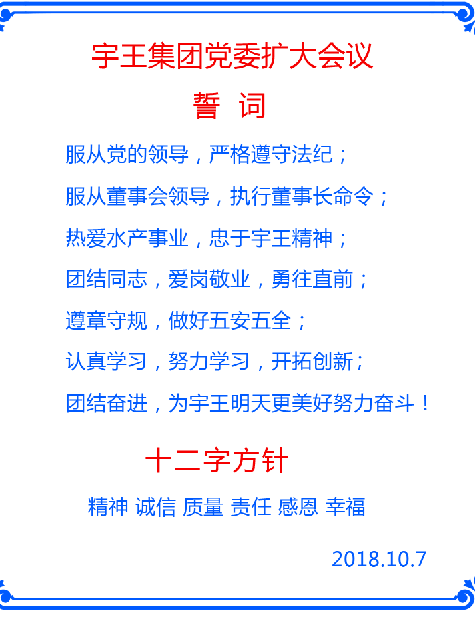 最后,由苗总亲拟宇王集团党委誓词,提出“精神 诚信 质量 责任 感恩 幸福”十二字方针,以此作为宇王集团党员行为标准以及集团公司全体职工行为模版。全体与会人员庄重宣誓,此次会议圆满结束。